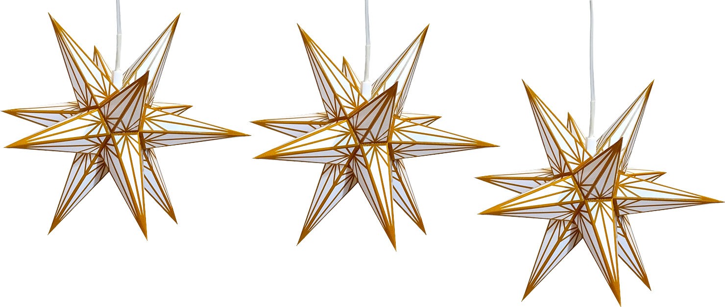 - 3er-Set Weihnachtsstern für Innen - Material: Papier - Durchmesser pro Stern: ca. 16 cm - mit LED-Beleuchtung (3 x 3,5V DC | 15mA | 8,37 Lumen) - Kabellänge: ca. 4,20m; mit Netzteil