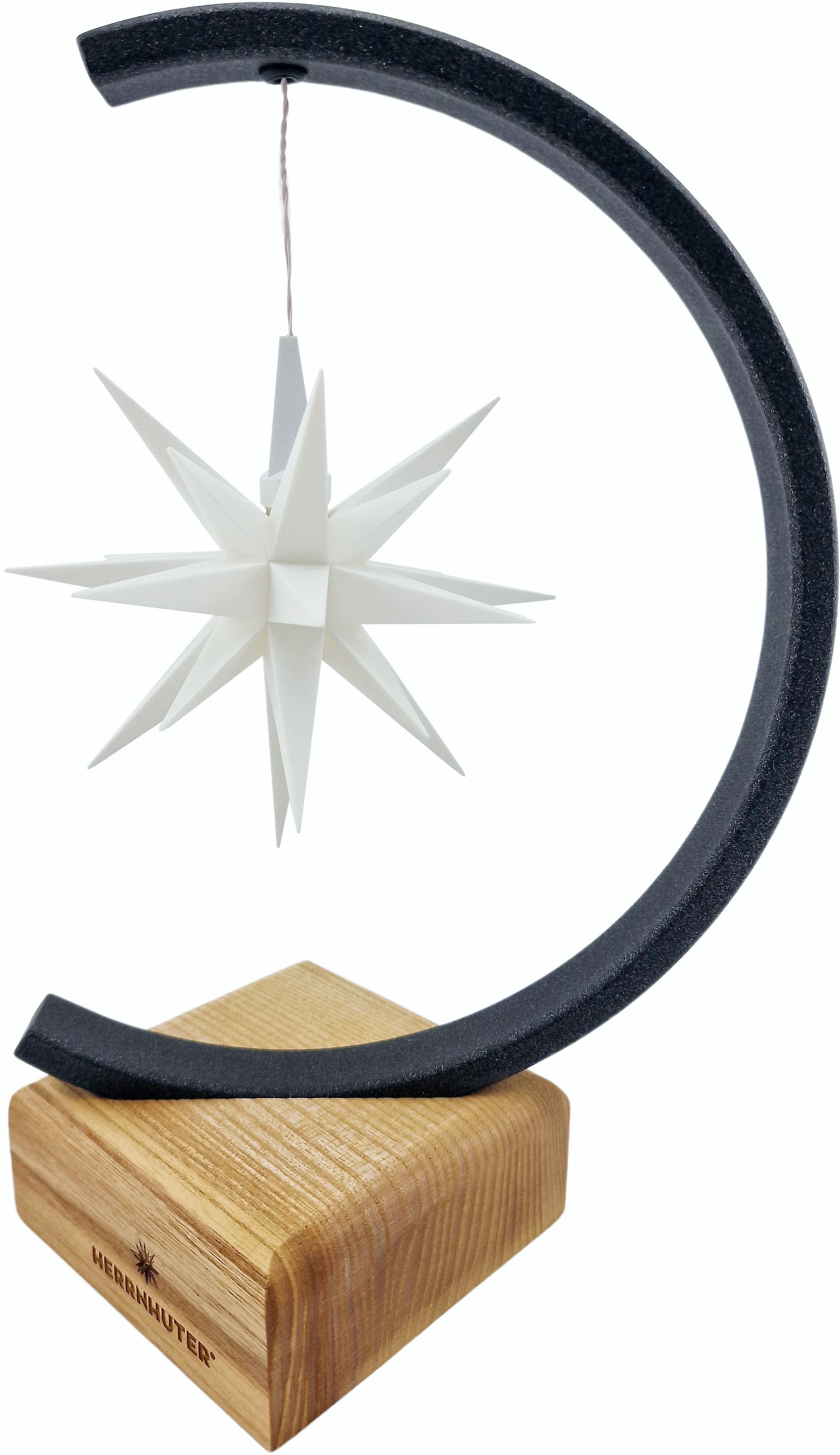 Höhe: 29cm Breite: 14cm Tiefe: 19cm Inhalt: Sternbogen im Holzsockel, Stern A1e weiß, 4 Batterien LR6 1,5V AA Material: Holz, Edelstahl Besonderheit: Metalldesign im Sortiment seit 2023 Hinweis: für A1e Sterne