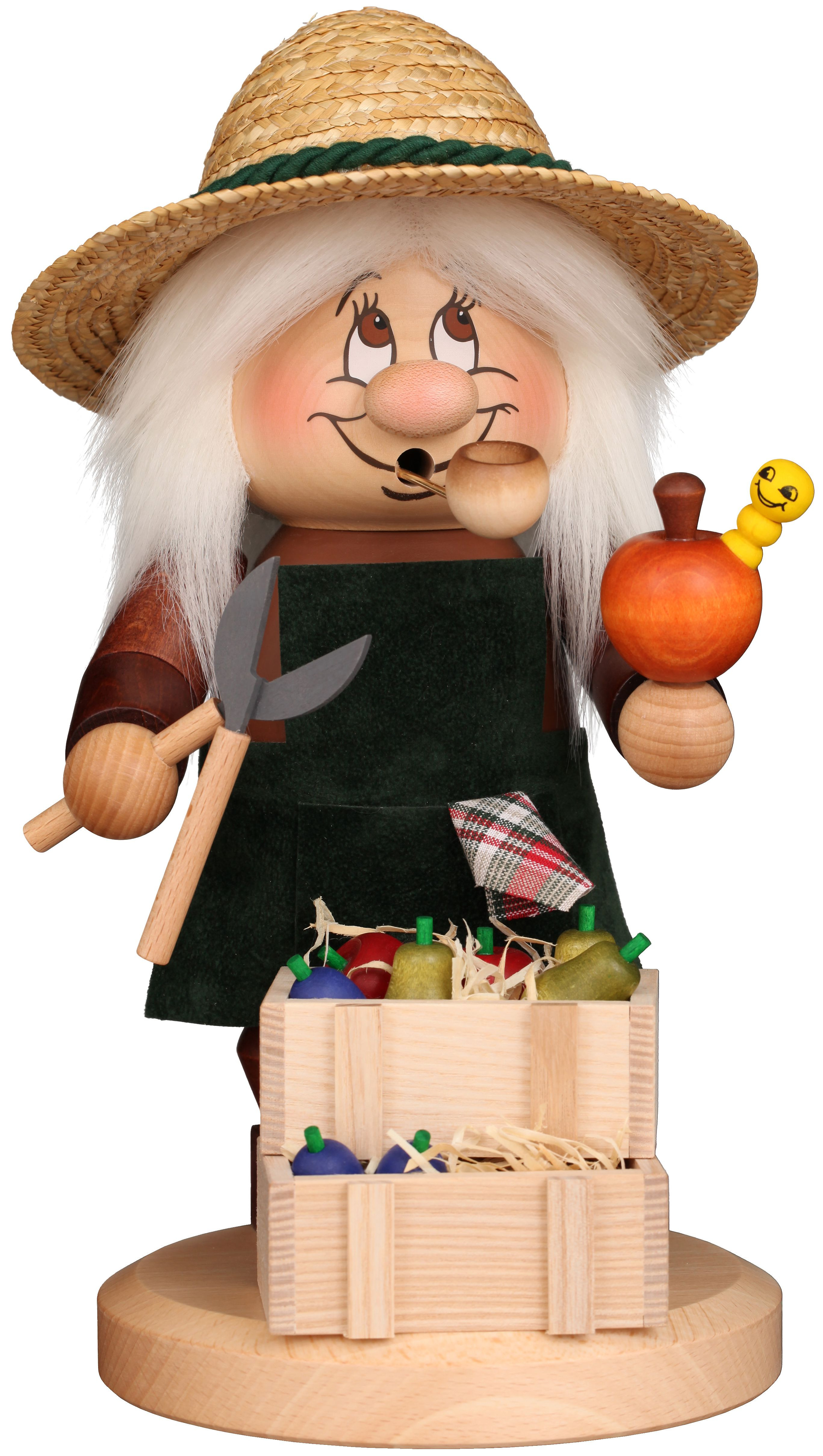 Der Obstwiesenbauer hat seine Obstkisten gut befüllt. In einem Apfel hat er einen kleinen Wurm entdeckt.