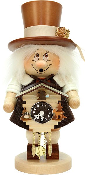 Vor sich hält der Wichtel eine funktionierende Schwarzwälder Kuckucksuhr. Das Pendel und die Aufziehketten sind golden. Zu beiden Seiten des Ziffernblattes sind kleine Tannenbäume zu sehen. Ein Pilz und ein Rehkitz stehen vor diesen. Über dem Ziffernblatt kann man einen fliegenden Vogel erkennen. Mit einem Schlüssel, welcher im Lieferumfang enthalten ist, kann die Uhr aufgezogen werden.