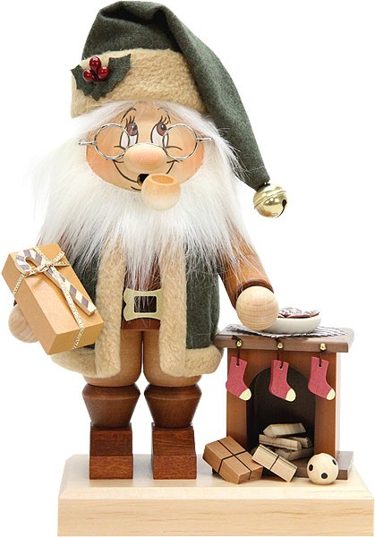 Der Wichtel Weihnachtsmann steht neben einem Kamin. Eine Schale mit Plätzchen steht darauf. Socken hängen am Kamin und geschichtetes Holz liegt darin, bereit zum anbrennen. Zwei Geschenke sowie ein Ball kann man davor liegen sehen.