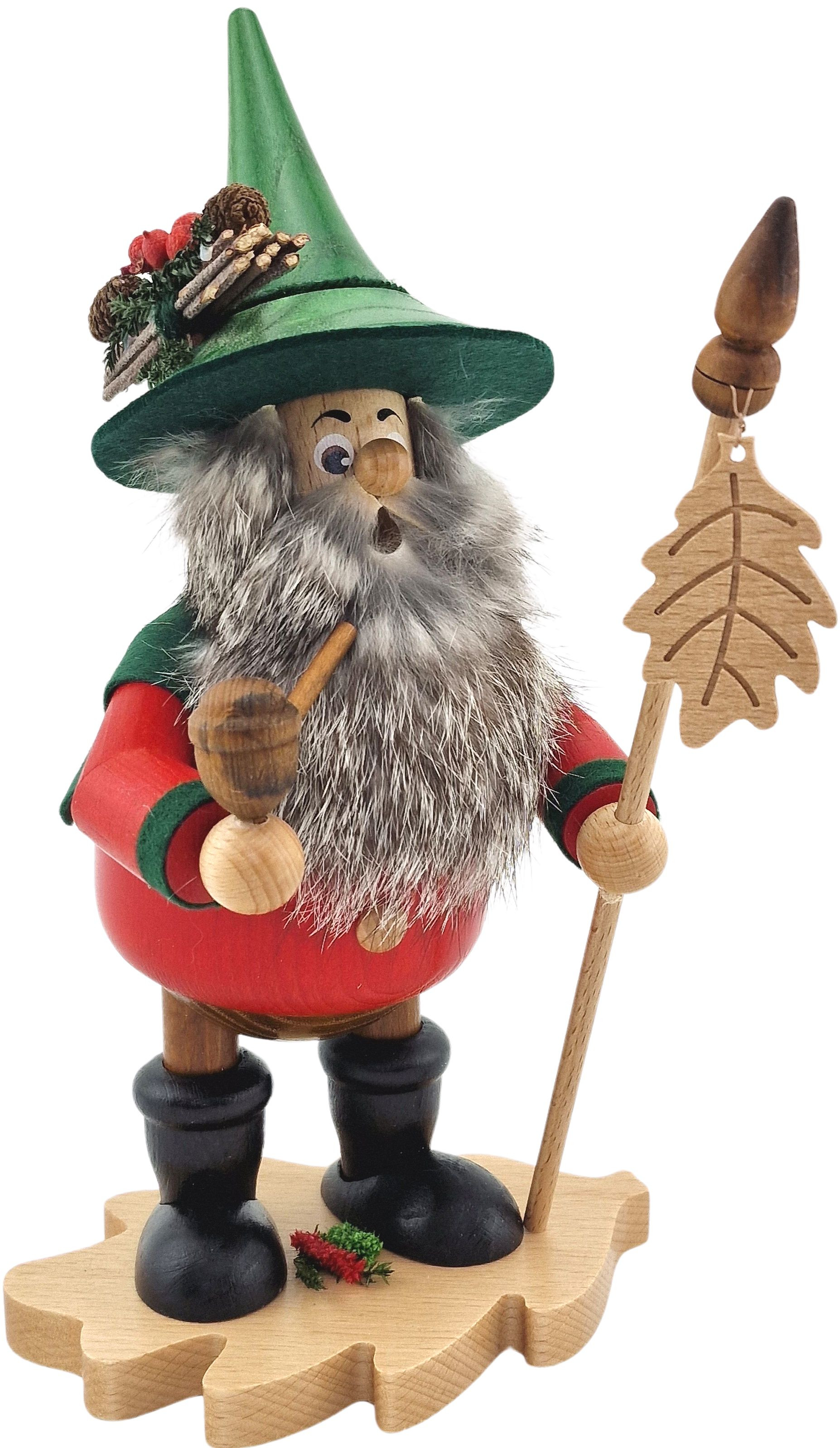 Der Räuchermann steht auf einem Buchenblatt. Auch an seinem Stab hängt ein kleines Buchenblatt.