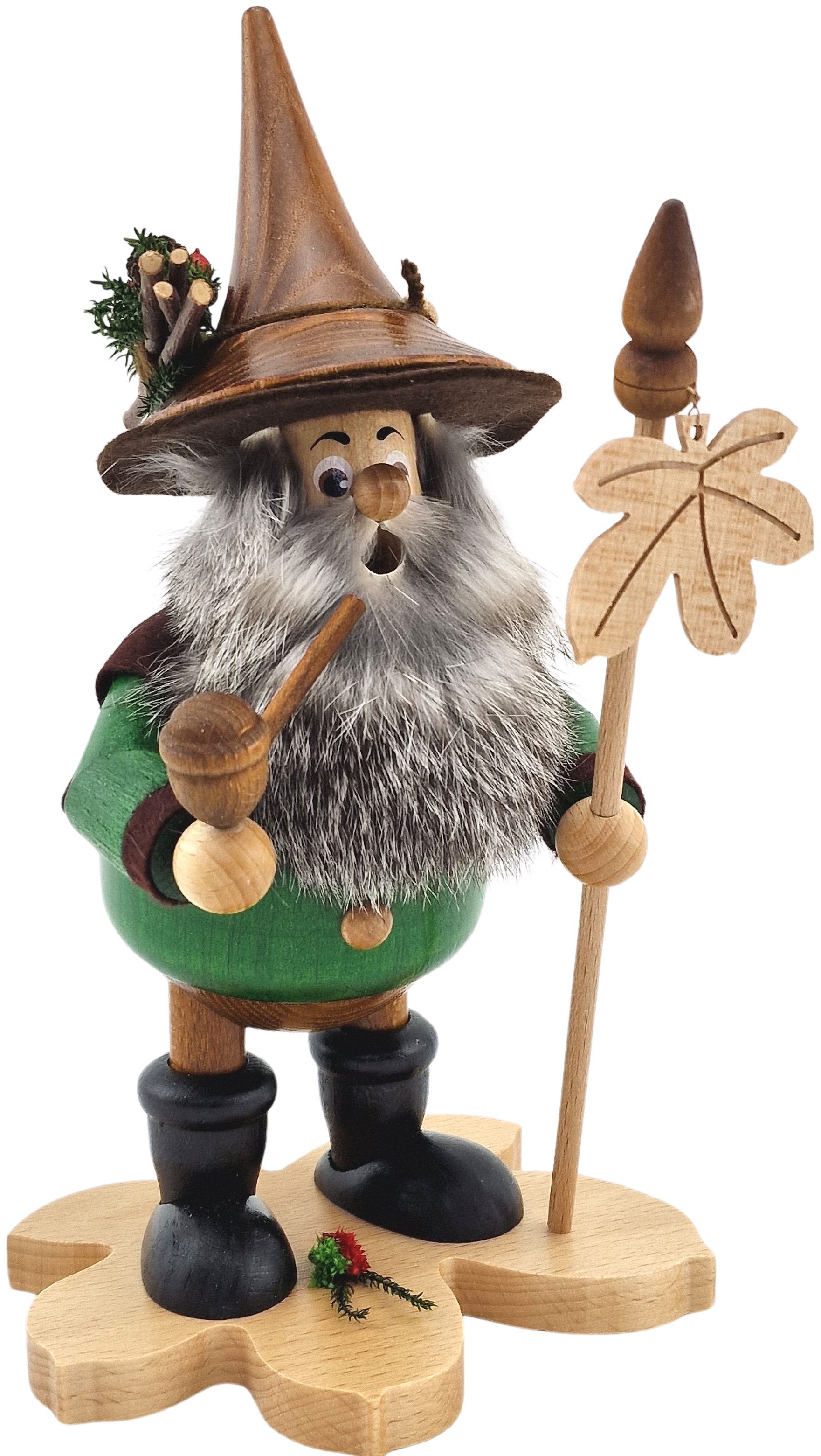 Der Räuchermann steht auf einem Kastanienblatt. Auch an seinem Stab hängt ein kleines Kastanienblatt.