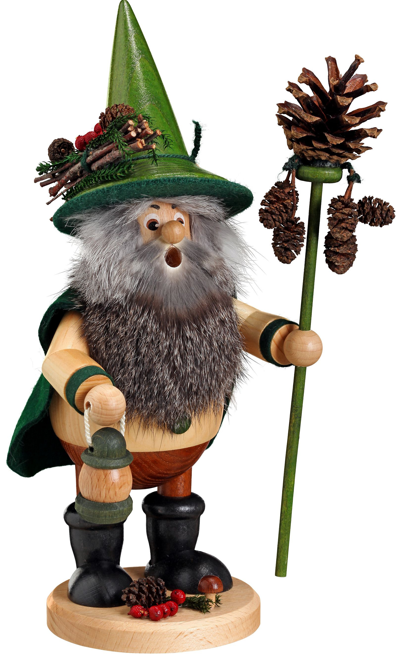 Der Zapfensammler hat helle Oberbekleidung, dunkel braune Hosen und schwarze Stiefel an. Auf seinem Kopf trägt er einen grünen Hut verziehrt mit Zapfen und Reisig. Über seine Schultern hat er sich einen grünen Umhang gelegt. In einer Hand hält er eine Laterne und in der anderen einen grünen Stab mit Zapfen.