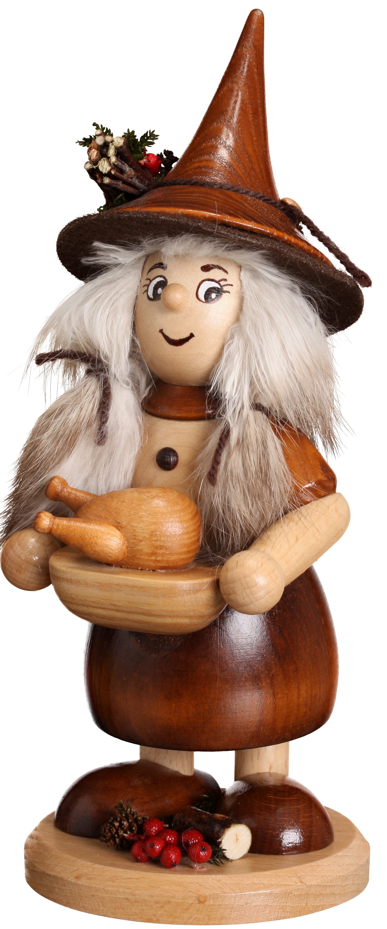 Die Wichtelfrau trägt ihre Kleidung ganz in braun gehalten. Auf ihrem Kopf hat sie sich einen braunen Hut gesetzt. In der einen Hand hält sie die Pfanne mit einem Brathähnchen.