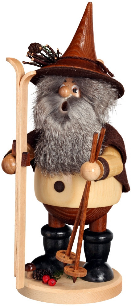 Der Skifahrer hat braune Hosen, schwarze Stiefel und einen braunen Hut an. Der Hut ist mit Reisig und eine paar Zapfen geschmückt. Seine Oberbekleidung ist hellbraun. Über seine Schultern hat er sich einen braunen Umhang gelegt. In einer Hand hält er seine Ski und in der anderen die Stöcke. Vor ihm liegen noch ein paar Zapfen und Pilze.