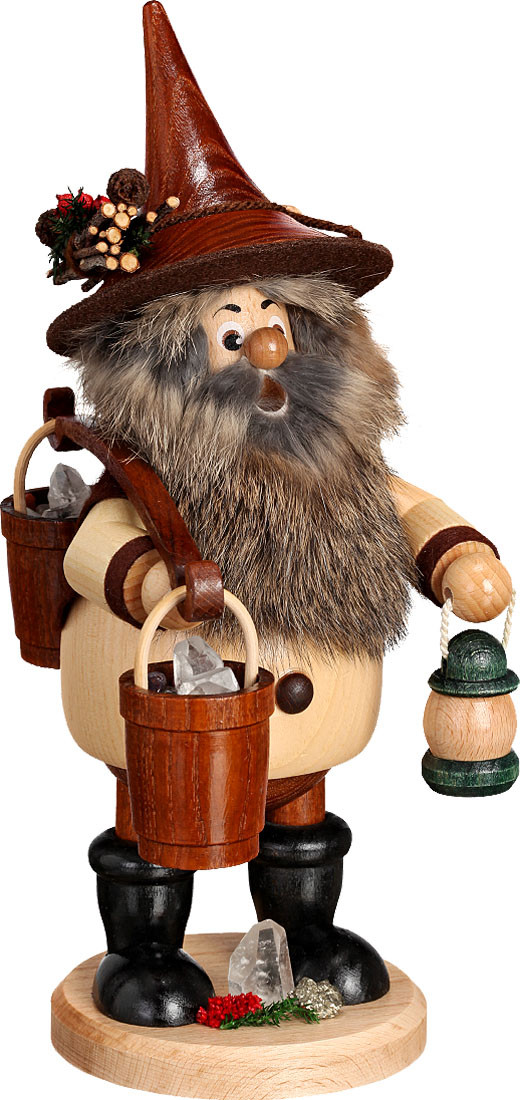 Der Waldwichtel kommt aus dem Berg. Über seine Schulter hat er eine Stange gelegt und an beiden Enden Eimer angehängt. Diese sind gefüllt mit Erzen. Ein Erzklumpen ist aus dem Eimer gefallen und liegt vor ihm auf der Wiese. Seine Laterne hält er in der anderen Hand.