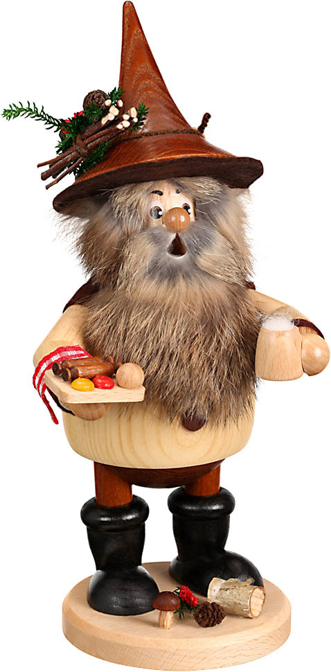 Der Wichtel macht gerade Pause. Er hat sich seine Lieblingsspeise geholt: Bockwurst mit Senf und Ketchup. In der anderen Hand hält er einen Krug Bier.