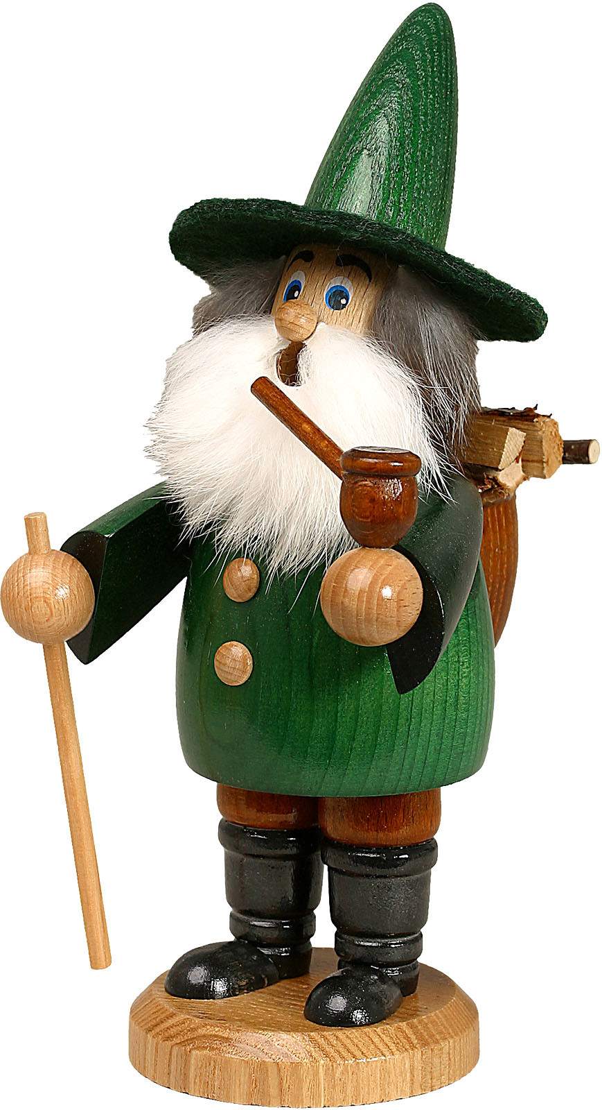 Der Holzsammler ist bekleidet mit einer grünen Jacke, brauner Hose, schwarzen Stiefeln und einem grünen Hut. Auf seinem Rücken befindet sich eine Kiepe voll mit Holz. Auf dem Heimweg raucht er seine Pfeife. Den Wanderstock hält er in einer Hand.