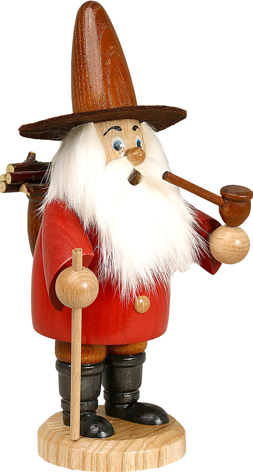 Der Holzsammler ist bekleidet mit einer roten Jacke, brauner Hose, schwarzen Stiefeln und einem braunen Hut. Auf seinem Rücken befindet sich eine Kiepe voll mit Holz. Auf dem Heimweg raucht er seine Pfeife. Den Wanderstock hält er in einer Hand.