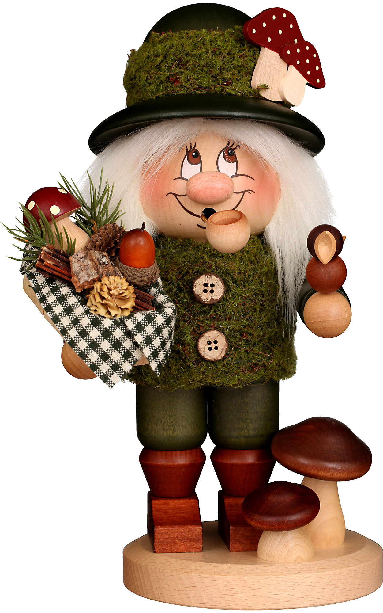 Der Moosmann ist ein Naturbursche. Seine Kleidung besteht zu 100% aus natürlichen Stoffen, wie die Moosjacke. Er sammelt die Früchte des Waldes. Ein kleiner Vogel hat sich auf seiner Hand niedergelassen.
