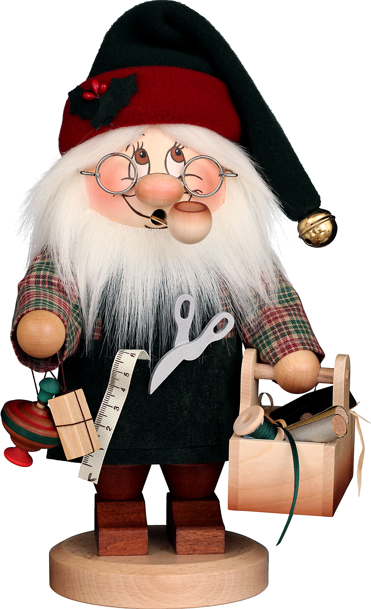Der Weihnachtsmann hat sich sein Nähzeug geschnappt. Mit Schere, Maßband und Korb mit Nadel, Faden und Soffen ist er unterwegs zu seinem Arbeitsplatz. Hier bekommen Puppen schöne Kleider und Teddys ihre Knopfaugen.