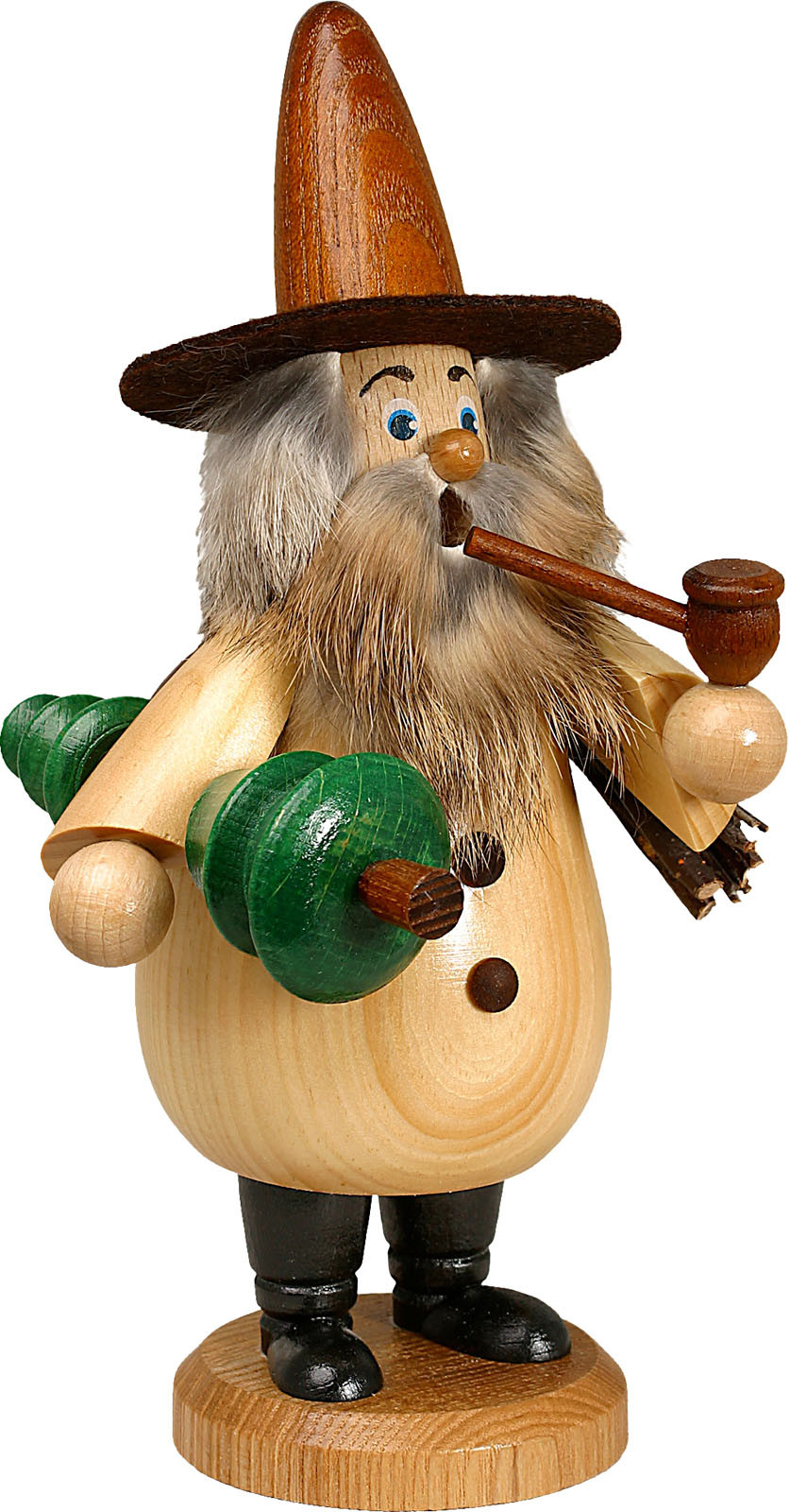 Der Wurzelzwerg trägt eine helle Jacke und dunkle Hosen. Ein brauner Hut sitzt auf seinem Kopf.Über eine Schulter hat er sich ein Bündel Reisig gehängt. Mit einem Arm hält er einen grünen Tannenbaum fest. Er raucht auf dem Heimweg gemütlich seine Pfeife.