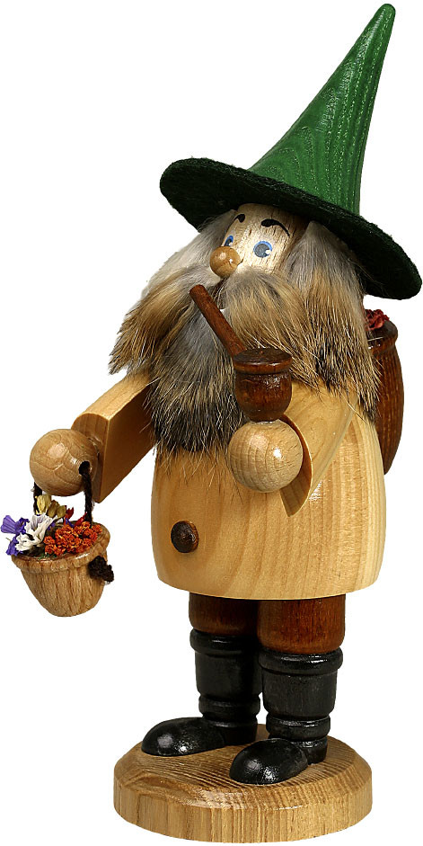 Der Wurzelzwerg trägt eine helle Jacke und dunkelbraune Hosen. Ein grüner Hut sitzt auf seinem Kopf. Auf seinem Rücken befindet sich ein Korb gefüllt mit Kräutern. In einer Hand hält er ein Körbchen. Auch dieses ist mit Kräutern gefüllt. Er raucht auf dem Heimweg gemütlich seine Pfeife.