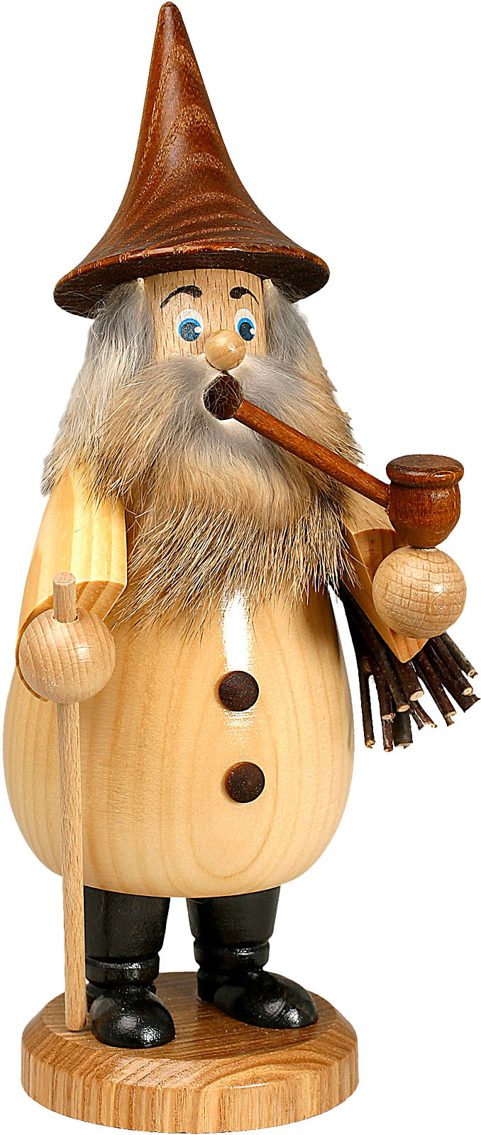 Der Wurzelzwerg ist mit einer naturfarbenen Jacke bekleidet. Auf seinem Kopf sitzt ein brauner Hut. Er hat sich ein Bündel Reisig über die Schulter gehängt und hält in einer Hand einen Wanderstab. Gemütlich raucht er seine Pfeife auf dem Heimweg.