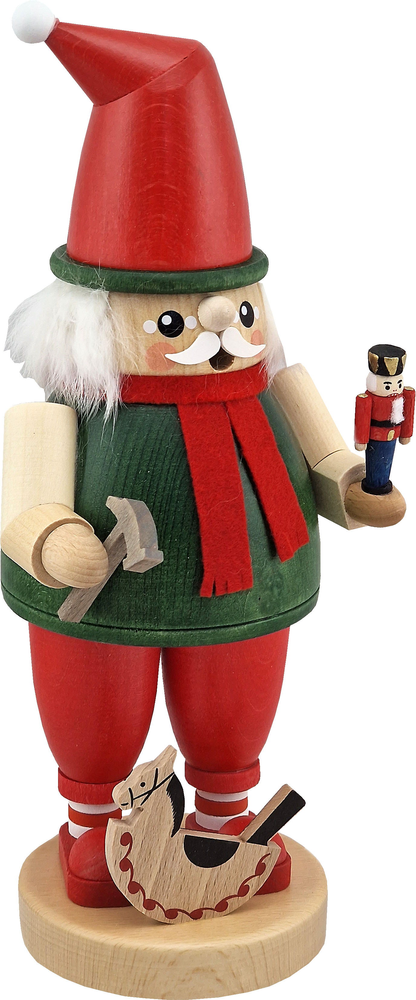 Der Zwerg hilft dem Weihnachtsmann bei der Herstellung der Spielzeuge. Gerade hat er einen Spielzeugnussknacker fertig gestellt. Das Pferdchen vor seinen Füßen wartet noch auf seinen Reiter.